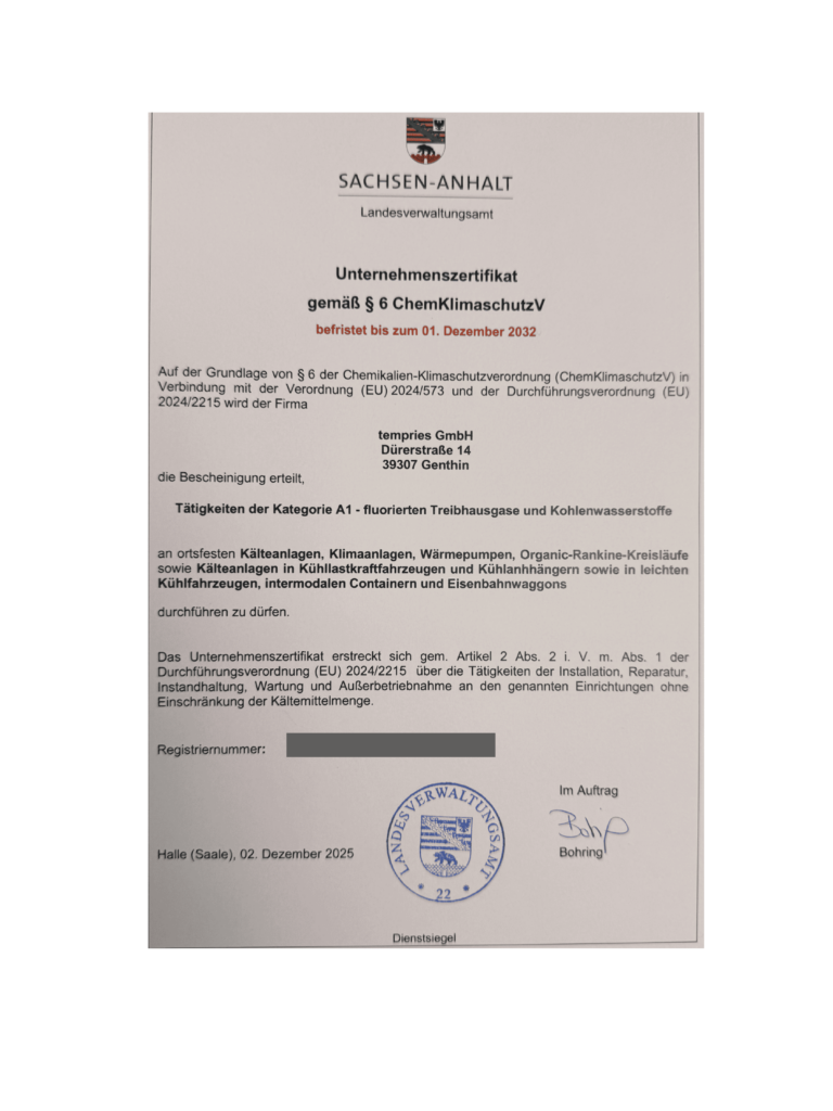 Wir freuen uns, ein wichtiges Update aus unserem Unternehmen zu teilen: Tempries ist jetzt offiziell nach § 6 der ChemKlimaschutzverordnung zertifiziert.